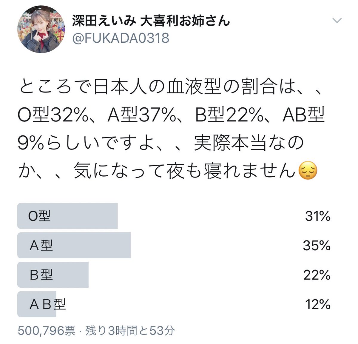 深田えいみさんが日本人の血液型の割合をツイッターアンケートで検証 50万人の回答集計に成功した結果がわりと凄い結果に Togetter
